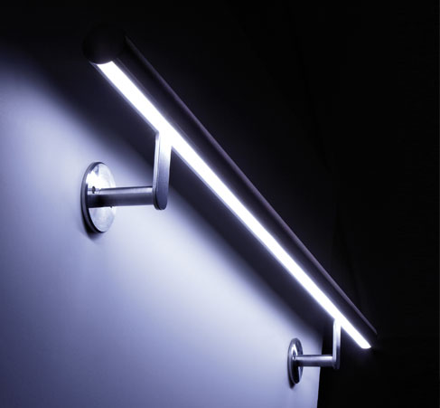 Elegant und innovativ, die dot-spot Handlaufbeleuchtung für DAIDALOS ® Nutrohre mit 48 mm Durchmesser bringt ein Plus an Sicherheit. Die dot-spot Handlaufbeleuchtung kann je nach Lichtbedarf mit unterschiedlichen LED Bändern ausgestattet werden. So lassen sich vielfältige